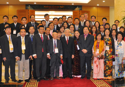 Tổng Bí thư Nguyễn Phú Trọng chụp ảnh lưu niệm cùng đoàn kiều bào ngày 8/4/2011 nhân dịp đoàn kiều bào về dự Giỗ Tổ Hùng Vương 2011. Ảnh https://quehuongonline.vn