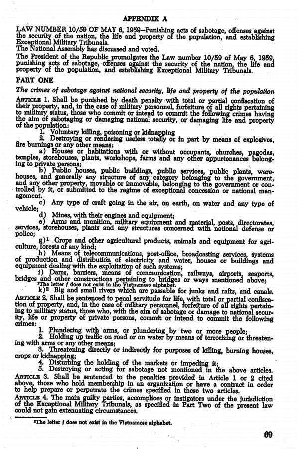 - - Liệt kê “những hoạt động phá hoại” [Appendix A, từ trang 69 đến 70, Phần 1] và hệ thống tổ chức của “Tòa án Quân sự Đặc biệt” [Appendix A, từ trang 70 đến 71, Phần 2]