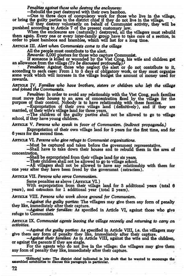 - Trang 309 – “Báo Cách mạng Quốc Gia, 28-4-1959:” Ngày xưa, khi lòng dân chưa yên, khi số kẻ thù của quốc gia còn đông, các nhà cầm quyền đã ban hành những đạo luật nghiêm khắc, ra lệnh vứt bọn tội phạm vào vạc dầu, trói chúng vào những cột đồng được nung đỏ, vứt chúng làm mồi cho cọp đói … Nếu ngày nay chúng ta không có những luật lệ cũng nghiêm khắc như thế thì bọn Cộng sản sẽ lợi dụng để vĩnh viễn thống trị nông thôn.”