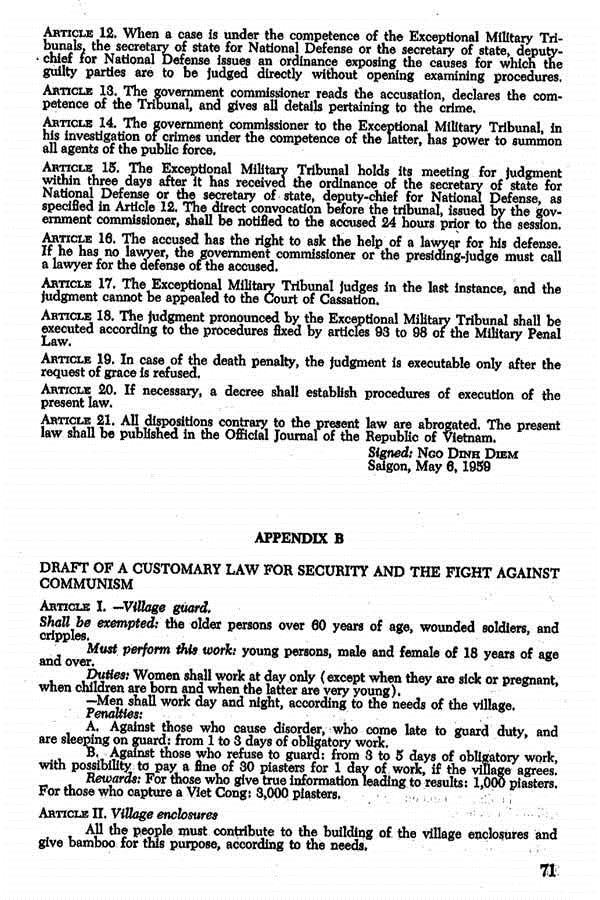 Theo Chương 4 trong tài liệu “Diem and The Republic Of Vietnam (1955-1960)” [xem link https://www.sparknotes.com/history/american/vietnamwar/section4.rhtml ] thì: “Vào tháng 5, 1959, Diệm ban hành đạo luật 10-59, thiết lập các Tòa Án Quân Sự để đi săn lùng Cộng sản ở Nam Việt Nam, những người mà ông ta nhạo báng là Việt Cộng. Những Tòa Án này không đếm xỉa gì tới công lý, và Đạo luật 10-59 đã được áp dụng một cách tàn bạo… Chế độ Diệm là chế độ phi dân chủ, tham nhũng và cực đoan ngay từ đầu. (In May 1959, Diem passed Law 10/59 , establishing military tribunals to search out Communists in South Vietnam, whom he derisively referred to as Viet Cong. These tribunals were unconcerned with justice, and Law 10/59 was brutal in its application… Diem’s regime was undemocratic, corrupt, and extreme from the beginning.)