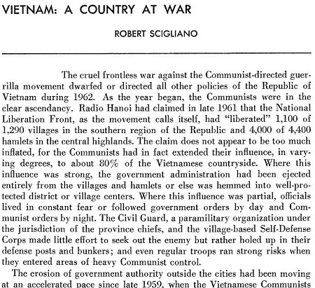 “Mặt trận Giải phóng miền Nam” (Việt Cộng) được thành lập tháng 12/1960 mà 2 năm sau, năm 1962, Việt Cộng coi như đã làm chủ tình hình nông thôn đến nỗi giáo sư Robert Scigliano đã phải than: “Vào năm 1962, Việt Cộng đã chiếm được 80% nông thôn của Việt Nam Cộng Hòa” [Robert Scigliano, Vietnam, A Country At War]. Vì vậy mà đầu năm 1963, Việt Cộng đánh cho một trận Ấp Bắc, “quân đội quốc gia” (do hai sĩ quan Công giáo là Huỳnh Văn Cao và Bùi Đình Đạm chỉ huy) chỉ còn biết … ôm đầu máu mà chạy !