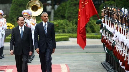 Chủ tịch nước Trần Đại Quang và Tổng Thống Obama duyệt đội danh dự trong buổi lễ chào đón Tổng Thống Obama ở thủ đô Hà Nội, ngày 23 tháng năm năm 2016. Ảnh Xinhua/Yan Jianhua