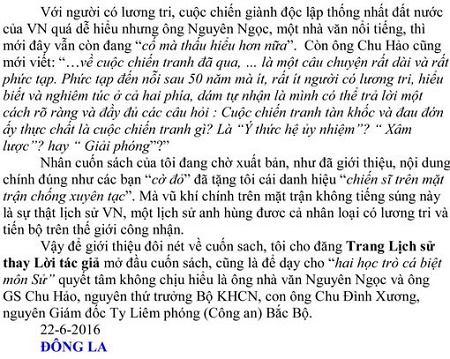 Vậy mà thật kỳ quái, lại có những người thuộc tầng lớp từ “nhân sĩ trí thức”, nhà văn, nhà báo, đến dân thường vì những nguyên cớ, những tham vọng và ảo tưởng khác nhau, nhân danh đấu tranh vì dân chủ tiến bộ chống lại Nhà nước Việt Nam. Họ tìm mọi cớ, bu vào mọi chuyện, kể cả việc cố tình không chỉ xóa trắng mà còn lộn ngược lịch sử, một hành động phản đạo lý, phản nhân văn và mất nhân tính, những muốn lịch sử nước ta bước lại những bước đi ngập bùn lầy và máu.. (Đông La)