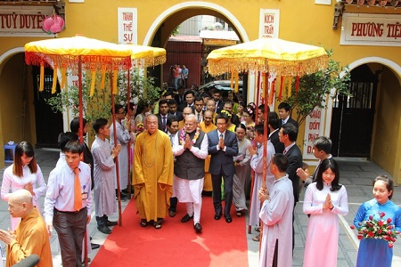 Tại đây ông nói rằng, “Thế giới cần phải đi trên con đường hoà bình, đem lại hạnh phúc và thịnh vượng, trong khi chiến tranh chỉ mang đến sự vĩ đại/phát triển tạm thời.” Hiện nay Ấn Độ đang tranh giành ảnh hưởng lãnh đạo Phật Giáo thế giới với Trung Quốc, nhất là Ấn Độ trở thành nơi che chở cho cộng đồng Tây Tạng lưu vong. Về cuộc viếng thăm này, VOA News 2/9/2016 đã trích dẫn lời bình luận của Giáo Sư Sukh Doe Muni của Institute for Denfence Studies tại Tân Delhi như sau, “Sự viếng thăm của vị lãnh đạo Ấn Độ là chỉ dấu mạnh mẽ cho thấy Ấn Độ muốn biểu lộ sự thân thiện, tình bạn, đoàn kết với Việt Nam, đặc biệt giữa lúc Việt Nam đang phải đối đầu với nhiều áp lực trong vùng từ phía Trung Quốc.” (Professor Sukh Doe Muni, fellow at the Institute for Defense Studies and Analyses in New Delhi, says the Indian leader's arrival Friday comes as "the question of South China Sea has come up in a big way." "Narendra Modi's visit actually is the strong indication of India showing its friendship, camaraderie, solidarity with Vietnam, particularly at the time when Vietnam is facing lots of pressure in the region from China.)