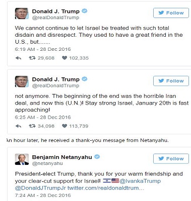 Quyết định của thế giới là như thế. Nếu Ô. Trump hết lòng bênh vực Do Thái, coi thường phản ứng của quốc tế thì Hoa Kỳ sẽ bị cô lập. Theo Reuters, Thủ Tướng Netanyahu vừa ra lệnh cho bộ trưởng ngoại giao xét lại mối liên hệ với Liên Hiệp Quốc bao gồm tiền Do Thái đóng góp cho LHQ và sự hiện diện của các đại biểu LHQ tại đất nước này. Bộ trưởng quốc phòng Do Thái loan báo cắt đứt liên hệ về mặt dân sự với Palestines. Thủ tướng Do Thái đã triệu tập 15 đại sứ kể cả các quốc gia hội viên thường trực của Hội Đồng Bảo An như Mỹ, Anh, Pháp, Nga, Trung Hoa để tra vấn về quyết định của họ vừa rồi và cam kết sẽ có biện pháp trả thù. Do Thái đã lên án Ô. Obama đã đạo diễn quyết định “tủi nhục” này.