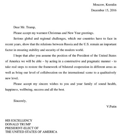 - AFP ngày 23/12/2016: “Tổng Thống Tân Cử Donald Trump đã công bố bức thư mang tính hòa giải nhân ngày lễ của Tổng Thống Putin và nói rằng hai quốc gia cần tiến tới việc xây dựng một mối quan hệ mới hay đi vào con đường khác. Ô. Trump đã cho phổ biến bức thư đề ngày 15/12/2016 sau khi nghe nói là đã phớt lờ những lo lắng là ông sẽ tiến hành một cuộc chạy đua vũ trang. Trong bức thư, Ô. Putin nói rằng những thách đố khu vực và toàn cầu mà hai quốc gia chúng ta phải đối đầu cho thấy mối liên hệ giữa Hoa Kỳ và Nga vẫn là yếu tố quan trọng bảo đảm an ninh và ổn định cho một thế giới hiện đại. Tôi hy vọng rằng sau khi ngài đảm nhận chức vụ tổng thống, chúng ta có thể hành động trong một tư thế xây dựng và thực tiễn, tiến hành từng bước phục hồi lại khuôn khổ quy định hợp tác song phương trên những lãnh vực khác biệt, cũng như đưa sự hợp tác hai bên trong bối cảnh quốc tế lên tầm mức hiệu quả mới.”