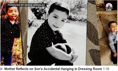Ngày 21/3/2017 MSNBC đưa tin về một cái chết lạ kỳ “Một em bé 4 tuổi ở Minnesota vô tình chết ngạt trong phòng thử của một tiệm bán đồ cũ và quần áo cũ. Theo lời khai của bà mẹ, Ryu Pena chơi trong phòng thử thì bà ngoại đang bận thử quần áo. Bà ngoại lên tiếng gọi và lần đầu em bé lên tiếng trả lởi. Rồi bà bước ra ngoài phòng thử, nhìn dưới cánh cửa phỏng thử bên kia thì không thấy chân người. Bà vội ra ngoài tìm em bé, khi bà quay lại, bước vào phòng thì thấy xác em treo lơ lửng ở đó. Theo lời kể của người mẹ tên Denise Gonzales, em bé đã lấy một chiếc ghế đẩu ở phòng bên cạnh, leo lên và kéo chiếc áo khoác có chùm đầu (sweatshirt) lên để nghịch chơi, đâu ngờ chiếc chùm đầu dính vào móc áo gắn ở cánh cửa phòng. Em bé lúng túng và chới với, cuối cùng chết trong tư thế treo cổ.”