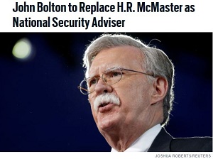 - Tổng Hợp ngày 23/3/2018: Tổng Thống Donald Trump vừa sa thải cố vấn an ninh quốc gia -Tướng McMaster và thay bằng Ô. John Bolton- cựu đại sứ Hoa Kỳ tại LHQ dưới thời Tổng Thống Bush Con khiến dư luận lo lắng vì lập trường “siêu hiếu chiến” của ông này.
