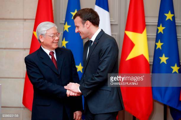 French President Emmanuel Macron (R) shakes hands with Nguyen Phu Trong (L), Secretary-General of the Communist Party of Vietnam, after a joint statement at the Elysee Palace in Paris, on March 27, 2018. /
