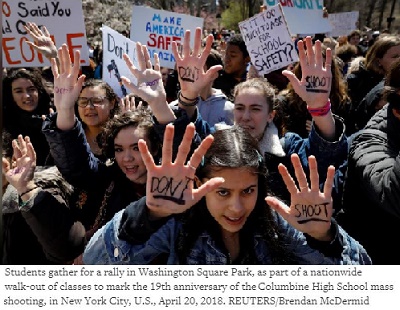 - Reuters ngày 20/4/2018: “Vào ngày hôm nay, cả chục ngàn học sinh bỏ học khắp nước Mỹ, đánh dấu năm thứ 19 cuộc thảm sát tại Trung Học Columbine để bày tỏ tình đoàn kết và áp lực các nhà lập pháp ban hành lệnh kiểm soát súng đạn mạnh hơn nữa.”