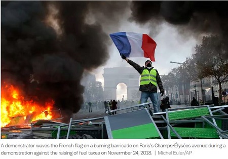 - ABC News ngày 24/11/2018:“Cuộc biểu tình tại Paris của khoảng 8000 người để chống lại việc tăng giá săng dầu của Tổng Thống Macron bước qua ngày thứ tám. Paris như bị phóng hỏa. Lửa và khói bao phủ thành phố. Cảnh sát đã bắn lựu đạn cay và súng phóng nước vào đám người biểu tình.”