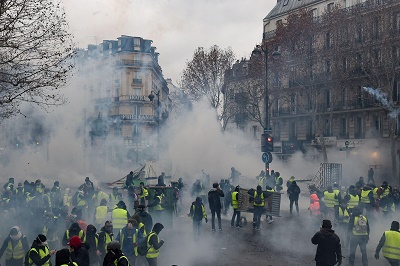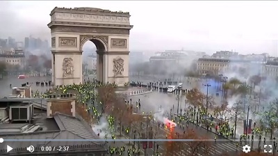 Theo AP ngày 1/12/2018, “Cuộc bạo động lớn nhất trong 50 năm của Pháp bao trùm lên trung tâm thủ đô Paris khi các người biểu tình mặc áo vét vàng đốt xe, đập phá cửa kính, ném đá vào cảnh sát, hôi của và dùng sơn màu bôi bẩn lên Khải Hoàn Môn (Arc de Triomphe). Các người biểu tình phản đối việc tăng thuế và giá sinh hoạt cao đã đụng độ với cảnh sát chống biểu tình và chính phủ đã đóng cửa một số khu vực du lịch nổi tiếng, bắn lựu đạn cay và súng nước để dập tắt tình trạng kinh hoàng trên đường phố. Một số người biểu tình đã yêu cầu Ô. Macron từ chức. Từ thượng đỉnh G-20 tại Á Căn Đình, Tổng Thống Emmanuel Macron lên án cuộc bạo động và nói rằng những ai tấn công cảnh sát và phá hoại Khải Hoàn Môn sẽ phải chịu trách nhiệm về hành động của họ và sẽ triệu tập phiên họp khẩn cấp của nội các vào ngày 2/12/2018.