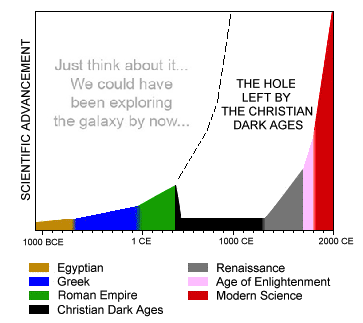 (Câu cuối của minh họa có nghĩa là: hãy thử nghĩ xem, này những người tin theo Kytô giáo, đáng lẽ ngày nay chúng ta có thể đang thám hiểm giải ngân hà đấy)