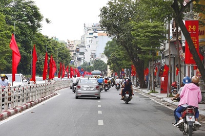 Nhiều tuyến đường và hai bên vỉa hè Hà Nội những ngày này đã được trang hoàng cờ đỏ, hoa tươi và các khẩu hiệu nhân dịp Quốc khánh.
