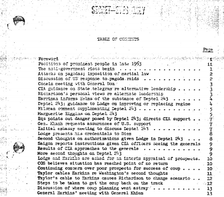 Một hồ sơ của Cục Trung Ương Tình Báo CIA mang mã số 80T01357A được giải mật và nhập vào Văn khố Quốc gia (NARA danh số 104-10214-10035) đã đưa ra một số chi tiết về những ngày sau khi chính phủ ông Ngô Đình Diệm tấn công các chùa VN, cho tới khi hoàn tất cuộc cách mạng của quân lực VNCH để lật đổ chế độ này. Hồ sơ nầy có tựa đề “DIEM REPORT (REPORT ON CIA AND U.S. GOVT INVOLVEMENT IN THE VIETNAMESE GENERALS’ COUP FO 1 NOVEMBER 1963” [Phúc trình về Diệm (Phúc trình về sự tham dự của CIA và Chính phủ Mỹ trong Cuộc Đảo chánh 1-11-1963].