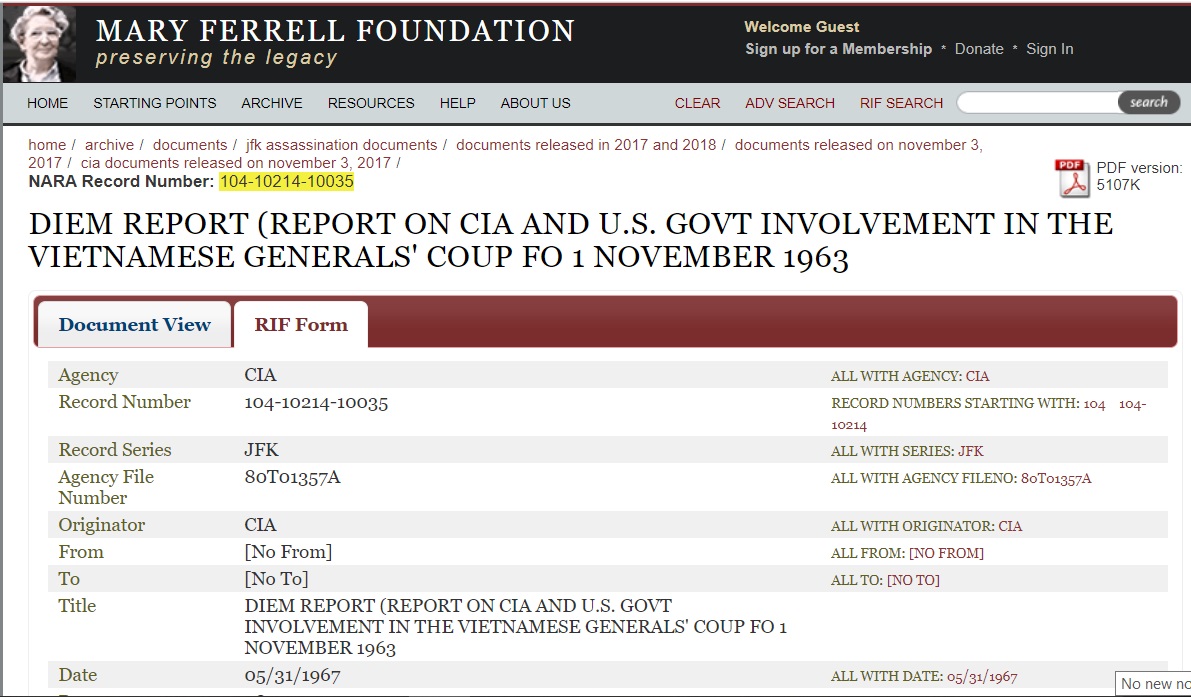 ● Hồ sơ mật CIA dài 48 trang, hoàn tất ngày 31/5/1967, đúc kết về cuộc đảo chánh 1/11/1963 tại Nam Việt Nam, đã được lưu trữ trên webpage của Văn Khố Quốc Gia (National Archives): https://www.archives.gov/files/research/jfk/releases/104-10214-10035.pdf