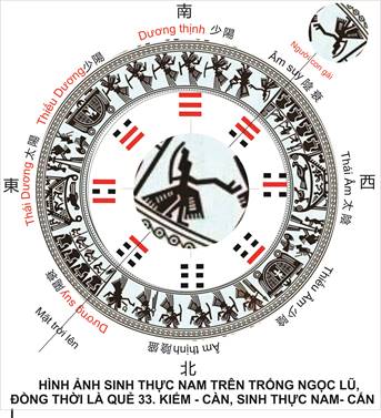 Đây là câu chỉ ra nguồn gốc của người Việt còn sót lại trong Thuyết văn giải tự, rõ ràng thông tin này do người Việt viết vào đây, thay vì nói người Việt là người Nam, người xưa lại dùng dịch học để chỉ ra tiêu chí đó, cụ thể câu đã trích dẫn trên. Chữ 三ở đây thực chất là là quái Càn. Theo dịch học thì Càn, Nhật, Đinh đều thuộc hướng nam, tuy nhiên ở đây người xưa cho biết rằng người Việt 粤ở lưỡng Quảng thuộc Âm – Hợi 亥, còn người Lạc Việt thuộc Dương- Tỵ巳. Tỵ Hợi đọc theo quái của Hà đồ tức là Đoài – Cấn hay quẻ Trạch Sơn Hàm, quẻ đầu tiên của phần Hạ kinh; đồng thời là một quẻ chứa đựng thông tin của người Việt. Về vấn đề tôi đã trình bày trong bài “Ngôi mộ 45, cuốn vô tự chân kinh của người Việt”. Ở đây chỉ nói ngắn gọn như thế để xác định những người giã gạo làm bánh trên trống đồng Ngọc Lũ là người Nam bằng tiêu chí dịch học. Còn nói theo thực tế thì trống đồng Ngọc Lũ là của người Việt tất nhiên những người đó là người Việt rồi.