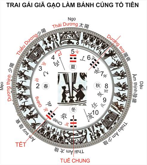 Ta thấy hình ảnh trên trống đồng Ngọc Lũ hoàn toàn tương thích với các mốc thời gian Tuế chung và Tết đã phân tích trên. Cụ thể quái Khảm nằm ở can Giáp, chi Tý, tức thời điểm tuế chung, tại thời điểm này người xưa đã khắc vào đó hình ảnh đôi trai gái đang giã gạo bằng Chày – Cối (16) ; đồng thời ở hướng Nam cũng có hai người giã gạo, điều này cho biết những người giã gạo đó là người Nam hay Việt, câu giải thích về người Việt 粤, 越trong Thuyết Văn giải tự cho ta hiểu điều đó: