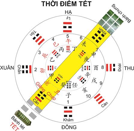 Tết là thời gian cuối năm, thời gian chỉ có trong thế giới hiện tượng hay Lạc thư mà thôi, cụ thể ở đây là 22 vị quan lang, tức 10 thiên can và 12 địa chi, hệ thống tính thời gian theo dịch học. Tuế chung hay cuối năm có nghĩa là vào cuối tháng Chạp(2) .