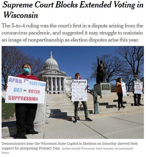 Mới đây, Tòa Tối Cao Liên Bang Mỹ đã buộc dân của bang Wisconsin phải đi trình diện tại chỗ để bỏ phiếu, và không cho phép dành thời giờ để bỏ phiếu bằng thư qua bưu điện - cho dù đại dịch Covid-19 đang xảy ra - và việc tụ tập đông tại phòng bỏ phiếu có thể gây nguy hiểm cho tính mạng của họ !