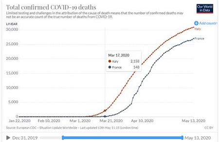 - Giản đồ sau đây cho thấy tổng số người chết trong khoảng thời gian từ 31 tháng 12 đến 13 tháng 5, tính cho nước Ý và nước Pháp. Sau ngày "làm phép trên không trung," 17 tháng 3, 2020 như đã đánh dấu chấm tròn trên giản đồ, số người chết ở Italy và Pháp càng tiếp tục tăng lên một cách đáng sợ. Biểu đồ tổng số người chết vì Covid-19 được xác nhận [Statistics and Research Coronavirus (COVID-19) Deaths, https://ourworldindata.org/covid-deaths] áp dụng cho nước Ý và nước Pháp.