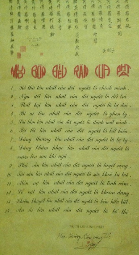 Trong giai đoạn vừa mở cửa, nhìn thấy những gì liên quan đến Phật giáo ai cũng rất vui mừng và bỏ qua những sai sót nhỏ. Nhưng sự việc sẽ không nhỏ chút nào nếu đặt vào thời gian hiện tại khi chúng ta đã có đầy đủ các ba bệ và hệ thống tổ chức Giáo Hội PGVN chặt chẽ. Khi đó, tấm liễn 14 điều Răn Của Phật này gây sốt thật sự và ai cũng muốn tìm mua cho bằng được để treo ở trong nhà mình vì ý nghĩa quá súc tích và sâu sắc. Tất nhiên lòng tự hào của mình cũng hân hoan theo không kém và luôn thầm cảm ơn, ngưỡng mộ chư vị đã có công làm ra bảng chữ như vậy.