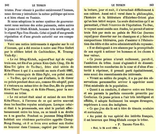 Những gì tôi nói ở đây là do mắt thấy và tai nghe. Trong cái nhìn đặc biệt vì lợi ích nước Pháp, việc Đồng Khánh lên ngôi quả là hoan hỉ (Ce que j’en dis là est à titre de témoin, oculaire et auriculaire. Au point de vue spécial des intérêts francais, il est heureux que Dong-Khánh occupe le trône)”.
