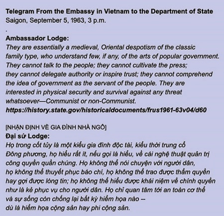 ■ Ngày 29/8/1963. 6 p.m. Điện văn từ Tòa Đại sứ gửi về Bộ Ngoại Giao Mỹ. Ký tên Lodge. Chúng ta đã bước tới chỗ không thể trở ngược lại được: lật đổ chính phủ Diệm. Không trở ngược lại được, bởi vì, theo tôi nhìn, với chính phủ Diệm, chúng ta không thể nào chiến thắng Việt Cộng. Dù là với Diệm hay với bất kỳ ai trong gia đình nhà Ngô nắm quyền, cũng không thể nào chinh phục được lòng dân Viêt Nam, như giới trí thức trong và ngoài chính quyền, giới quân đội và dân sự -- đó là chưa kể tới dân Mỹ. Trong vài tháng vừa qua (và đặc biệt, từng ngày) họ [nhà Ngô] đã mất lòng dân tới mức không thể đo lường nổi. Chúng ta nên toàn lực giúp các tướng đảo chánh. Tôi nhận thấy rằng [giúp đảo chánh] sẽ có rủi ro rất lớn là mất Việt Nam. Nó cũng liên hệ một số rủi ro làm người Mỹ chết. Tôi sẽ không bao giờ đề nghị nếu tôi cảm thấy có một cơ may hợp lý để giữ Việt Nam với Diệm. Tướng Harkins nghĩ rằng tôi nên yêu cầu Diệm từ bỏ Nhu trước khi giúp các tướng đảo chánh. Nhưng tôi tin rằng, yêu cầu như thế sẽ không có kết quả và sẽ có hậu quả nghiêm trọng là sẽ bị các tướng xem là người Mỹ do dự và muốn trì hoãn. Các tướng hiện thời đã không tin chúng ta nhiều. Điểm nữa, Diệm sẽ xin thời gian cho yêu cầu (từ bỏ Nhu) khó làm đó. Điều này trao trái banh về phía Nhu.