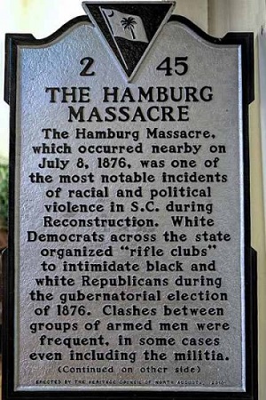 đã "bị đẫm máu và bị đe dọa" bởi các tổ chức Mỹ trắng. Trong thành trì của dân Mỹ đen tại Hamburg, bang South Carolina, hàng trăm dân Mỹ trắng mang vũ khí từ bang South Carolina và Georgia đã đổ ập vào thành phố Hamburg để giết dân quân tự vệ Mỹ đen và cướp bóc nhà cửa, cửa tiệm làm ăn buôn bán của dân Mỹ đen.