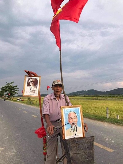 Chân dung cụ ông đạp xe giữa nắng ở Nghệ An treo ảnh Bác Hồ, Bác Giáp và cờ Tổ Quốc, cờ Đảng mừng kỷ niệm 131 năm ngày sinh của Bác Hồ.