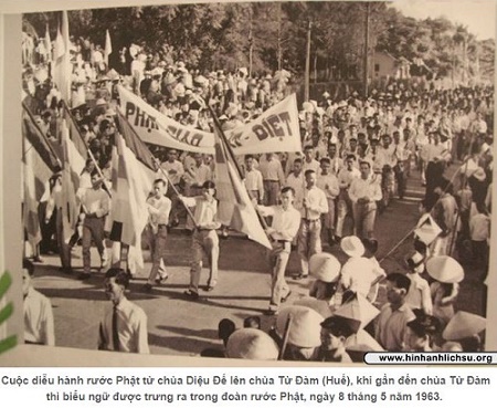 Đỉnh điểm của chính sách kỳ thị Phật giáo là khi chính quyền Ngô Đình Diệm ban hành Công điện 9195 ngày 6-5-1963, ra lệnh triệt hạ cờ Phật giáo vào dịp Đại lễ Phật đản năm 1963. Lập tức, chính quyền Ngô Đình Diệm vấp phải sự phản đối quyết liệt của Phật giáo miền Nam. Tại Huế, chiều ngày 7-5-1963, quần chúng, tín đồ Phật giáo bao vây tỉnh tòa với khí thế: “Phố phường như bừng dậy trong một cuộc động quân. Khắp các đường phố, từ trong thành, Đông Ba, Gia Hội từng đoàn người lũ lượt kéo qua cầu Trường Tiền. Từ Vĩ Dạ lên, ở trên Ga xuống, phía Kho Rèn, An Cựu về, dân thị xã và phụ cận đổ xô về phía tỉnh đường đông nghịt cả người, đông một cách đáng sợ, như cuồng phong tới, như bão tố lên”(14) .