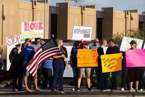 Những người chống vắc-xin tụ họp trước nhà thương nhi đồng ở Phoenix ngày 13 tháng 8, 2021