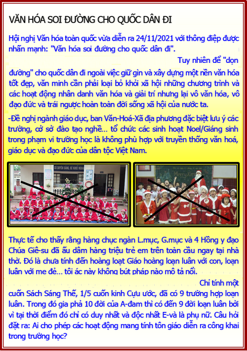 Việc đem "lễ Noel" vào học đường ở một xứ có đa số người không theo Thiên Chúa giáo là điều không được "lịch sự", có tính cách tham lam, trơ trẽn, lấn lướt. Đương nhiên nếu tiếp tục làm như thế thì sẽ mang lại nhiều điều lợi cho Thiên Chúa giáo. Điều này có lẽ liên quan đến điều 5 "Các hành vi bị nghiêm cấm" của Luật Tín Ngưỡng Tôn Giáo năm 2016" câu cuối (số 5): Lợi dụng hoạt động tín ngưỡng hoạt động tôn giáo để trục lợi.