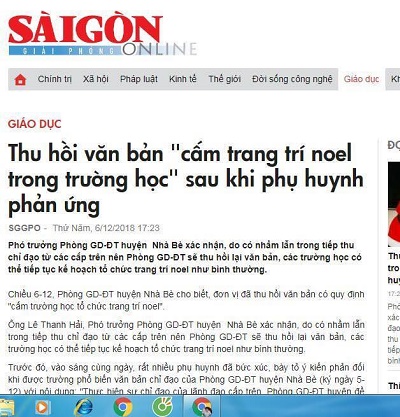Chúng ta, Vẫn còn nhớ, năm 2018 gần đến ngày chúa giáng sinh, Phòng Giáo dục huyện Nhà bè Tp HCM ra công văn yêu cầu không được trang trí đón Noen trong các trường học trong huyện, việc nhắc nhở là rất đúng, bởi, đó là luật, thế nhưng, thật đáng tiếc, bỏ qua luật, báo chí, nhất là (lều báo) nhâu vào "lên án ầm ĩ" cho đó là cấm đoán, mất tự do và nhân quyền.... do áp lực của Dư luận, UBND huyện Nhà Bè đã bỏ luật và dân túy chạy theo dư luận ra công văn yêu cầu P Giáo dục rút công văn đúng luật kể trên... Đó là điều đáng tiếc. (xem bài)