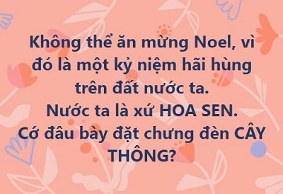 Những người VN yêu nước chân chính, chúng ta không cần Chúa, không muốn bất kỳ ai áp đặt con, cháu của mình bằng một cuộc cải đạo trá hình mang danh Chúa trong đêm giáng sinh của người công giáo Thế nên, hình ảnh Chúa, cùng ông già Noen và cây thông... chỉ được phép xuất hiện nơi người Công giáo sinh sống và các Nhà Thờ của họ. Nói như thế, cần được hiểu hình ảnh đón Giáng sinh không được phép xuất hiện trong môi trường giáo dục, nơi công sở và các nơi công cộng khác..