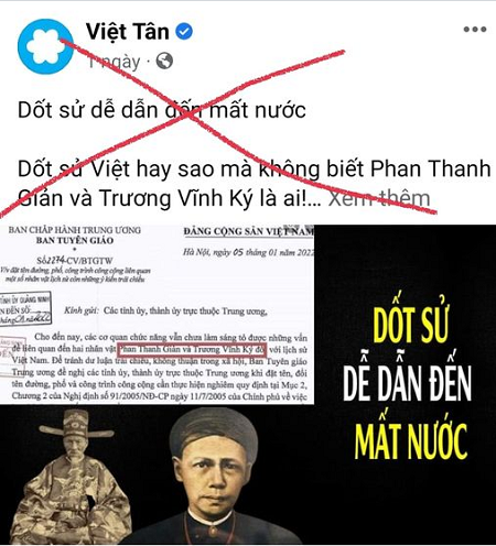 Sau khi Ban Tuyên giáo Trung ương ban hành văn bản quy định không lấy tên Phan Thanh Giản, Trương Vĩnh Ký để đặt tên đường, tên trường và các địa điểm công cộng (xem tham khảo số 3 ở dưới). Lập tức Việt Tân cay cú, có bài "dốt sử dễ dẫn đến mất nước". Thì ra bây giờ họ mới nhận ra! Đúng, dốt sử và xuyên tạc lịch sử rất dễ mất nước.