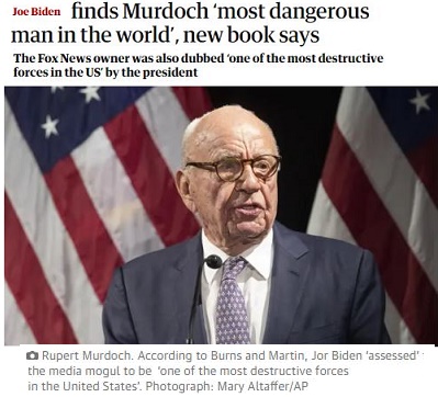 Theo The Hill ngày 4/4/2022, một nhóm thông tín viên của New York Times nói rằng trong một cuốn sách sắp tới đây, Ô. Joe Biden nói Rupert Murdoch- chủ đài truyền hình Fox News là kẻ nguy hiểm nhất trên thế giới.