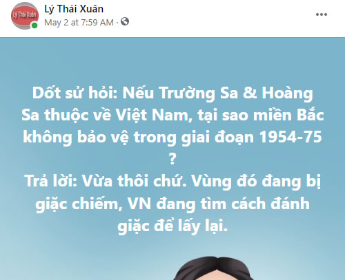 Trong này có nhắc "Chính quyền Sài gòn" (không phải quốc gia VNCH nhé) cũng có một số hoạt động đáng kể, nhưng cuối cùng đã thua ... trận đánh 15 phút với TQ lúc hải quân của TQ còn rất yếu.
