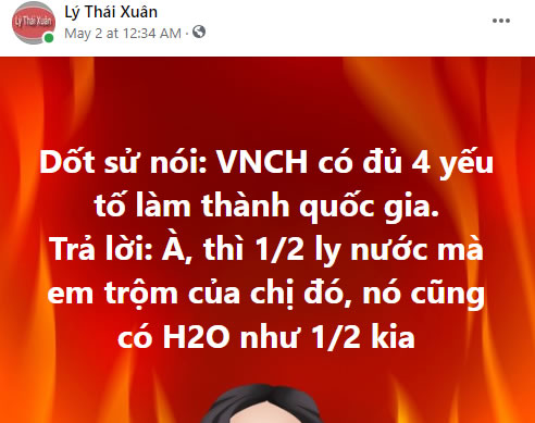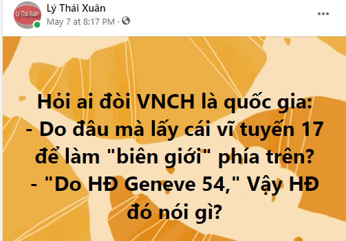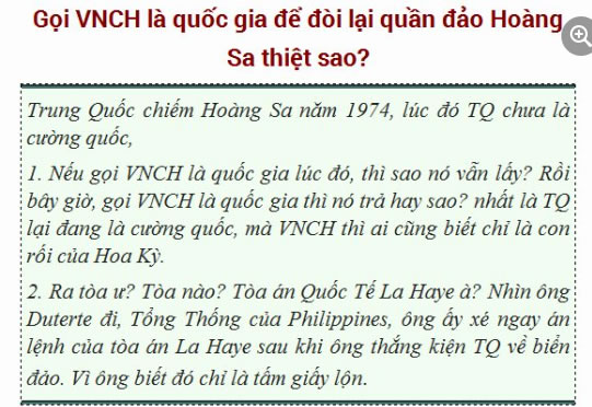 "Vậy hãy trả lời VNCH là cái gì đi! Khi mà định nghĩa một quốc gia. Thứ nhất là có thể chế nè, thứ hai có đất nè, VNCH có từ vĩ tuyến 17 trở xuống nè. Thứ ba là có dân nè, ít nhất là mười mấy triệu dân nè. Thứ tư là được một số các quốc gia công nhận, như là Mỹ, Anh, Pháp, Đức, Thái Lan, đa công nhận VNCH là quốc gia. Thì họ là 1 quốc gia, là 1 chủ thể pháp lý."