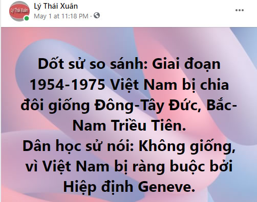 => 2. Lãnh thổ có xác định không? KHÔNG. Vĩ Tuyến 17 ở đâu mà có? Hiệp Định Geneve chỉ nói đó là giới tuyến quân sự tạm thời chờ Tổng Tuyển cử năm 1956.
