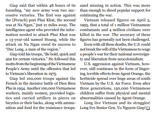 "Tuy nhiên, cuộc xâm lăng của Mỹ chống Việt Nam vẫn tiếp tục trong dạng thức những ảnh hưởng khủng khiếp, kéo dài, từ chất độc da cam, chất sát trùng khủng khiếp trải trên nhiều vùng rộng lớn ở Việt Nam bởi không quân Mỹ. Ngay cả sau ba thế hệ, 150,000 trẻ Việt Nam vẫn đau đớn bởi những dị dạng về thể chất và tinh thần gây nên bởi chất độc da cam. Cuộc tranh đấu của Việt Nam muôn năm! Đại Tướng Võ Nguyên Giáp muôn năm!"