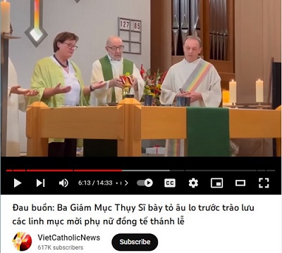 LTS: Trên kênh youtube VietCatholicNews, ngày 16/01/2023 có đăng tin như sau: "Đau buồn: Ba Giám Mục Thụy Sĩ bày tỏ âu lo trước trào lưu các linh mục mời phụ nữ đồng tế thánh lễ." Giám mục sở tại đã mở cuộc điều tra sơ bộ vì ông linh mục đã "lạm dụng phụng vụ". Giáo hội La Mã ở địa phương đã đưa ra Điều 907 của giáo luật GHCG "Cấm các phó tế CG và giáo dân CG dâng lời cầu nguyện "Thánh Thể", và thực hiện các hành động chỉ phù hợp với linh mục cử hành lễ."