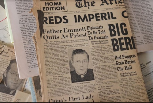 Một tờ báo cũ của Cộng hòa Arizona thông báo việc Emmett McLoughlin từ chức linh mục Công giáo. Ảnh do Rachel Bunning cung cấp.