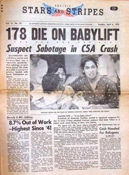 Bản tin của "Stars and Stripes", tờ báo của quân đội Hoa Kỳ tại vùng Thái Bình Dương, số ra ngày Chủ nhật, 6/4/1975, chạy tít "178 người chết trong (chiến dịch) Babylift", kèm theo tiêu đề "Nghi ngờ khủng bố trên chiếc C5A bị rơi"...