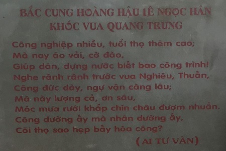 Phần trên phiến đá sa thạch, mặt trước khắc chìm hình ảnh hai vua, mặt sau trích đoạn thơ Ai Tư Vãng của Bắc cung Hoàng hậu Lê Ngọc Hân khóc chồng.