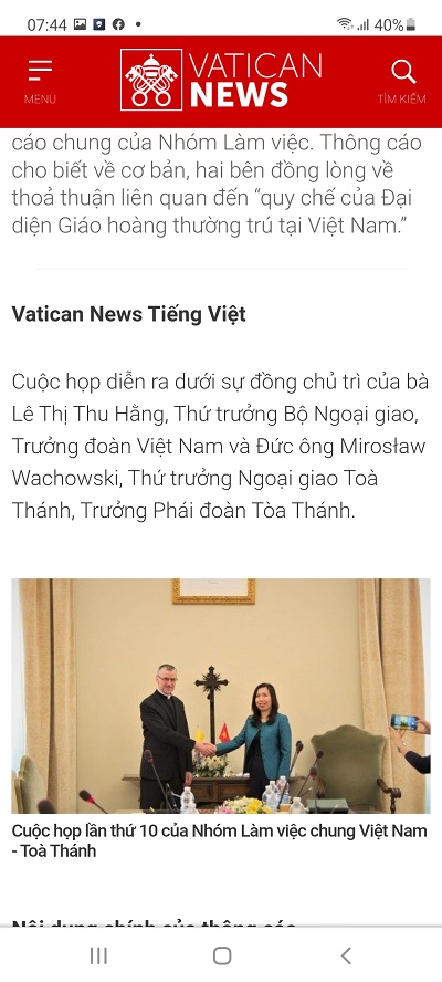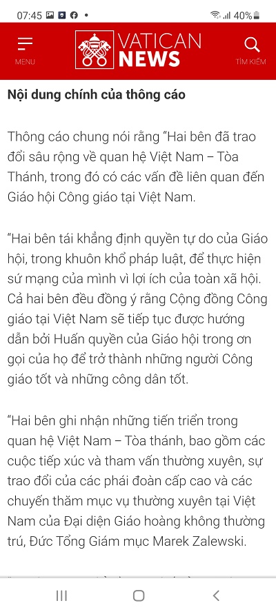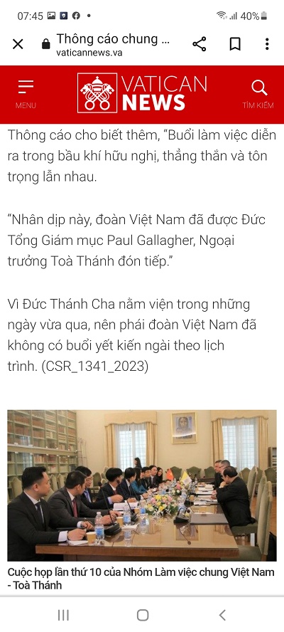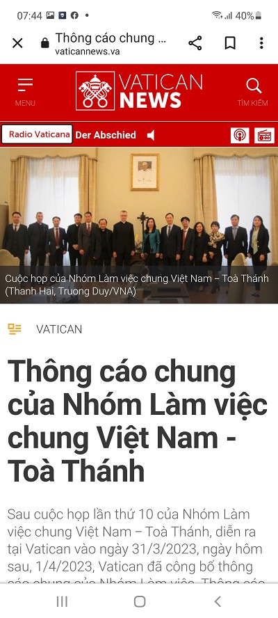 Ngày 1/4/2023, trên trang Vatican News tiếng Việt, cơ quan truyền thông chính thức của quốc gia Vatican, có đăng tin như sau, dưới đây xin tường thuật lại tin. Nội dung bình luận sẽ có bài viết sau. Những câu, cụm từ, từ được nhấn mạnh là do người tường thuật.