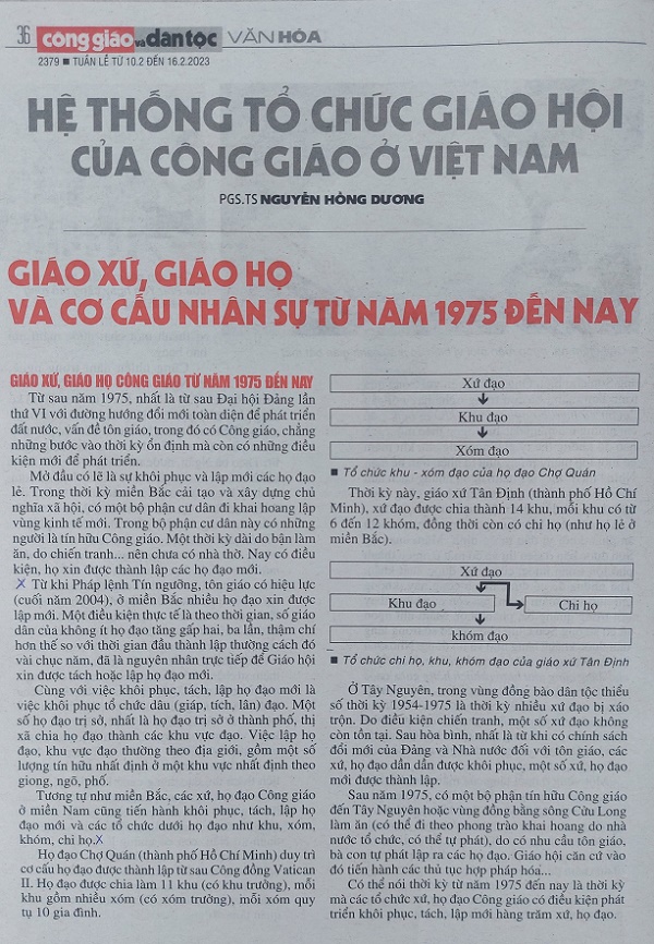 Bài báo được giới thiệu có nhan đề “Hệ thống tổ chức Giáo hội của Công giáo ở Việt Nam – Giáo xứ Giáo họ và cơ cấu nhân sự từ năm 1975 đến nay”, tác giả PGS Tiến sĩ Nguyễn Hồng Dương, đăng trên báo Công giáo và Dân tộc số 2379, tuần lễ từ 10.2 đến 16.2.2023., trang 36-37.