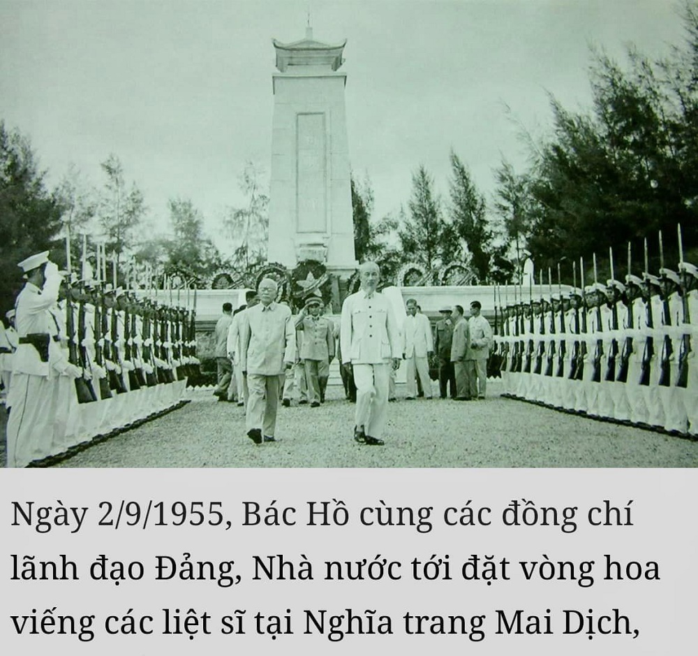 Trong buổi lễ đặt vòng hoa ở Đài Liệt sĩ ngày 31/12/1954, Người đã bày tỏ: “Các liệt sĩ hy sinh, nhưng công trạng to lớn của các liệt sĩ đã ghi sâu vào lòng toàn dân và non sông đất nước. Các liệt sĩ đã hy sinh, nhưng chí khí dũng cảm của các liệt sĩ thấm nhuần vào tâm hồn của toàn quân và dân ta trong cuộc đấu tranh đặng giành hòa bình, thống nhất, độc lập và dân chủ trong nước. Máu nóng của các liệt sĩ đã nhuộm lá Quốc kỳ vẻ vang càng thêm đỏ thắm. Tiếng thơm của các liệt sĩ muôn đời lưu truyền sử xanh”.