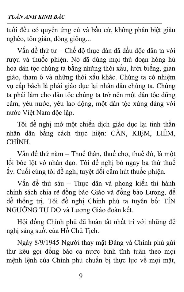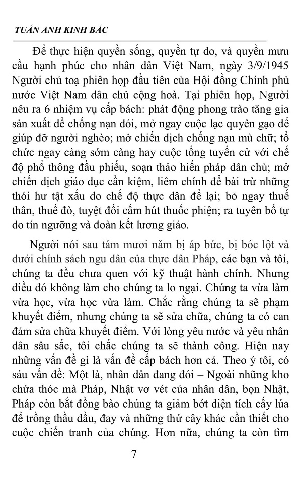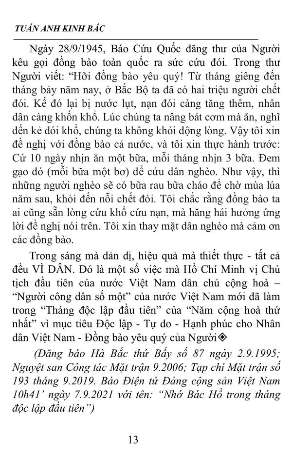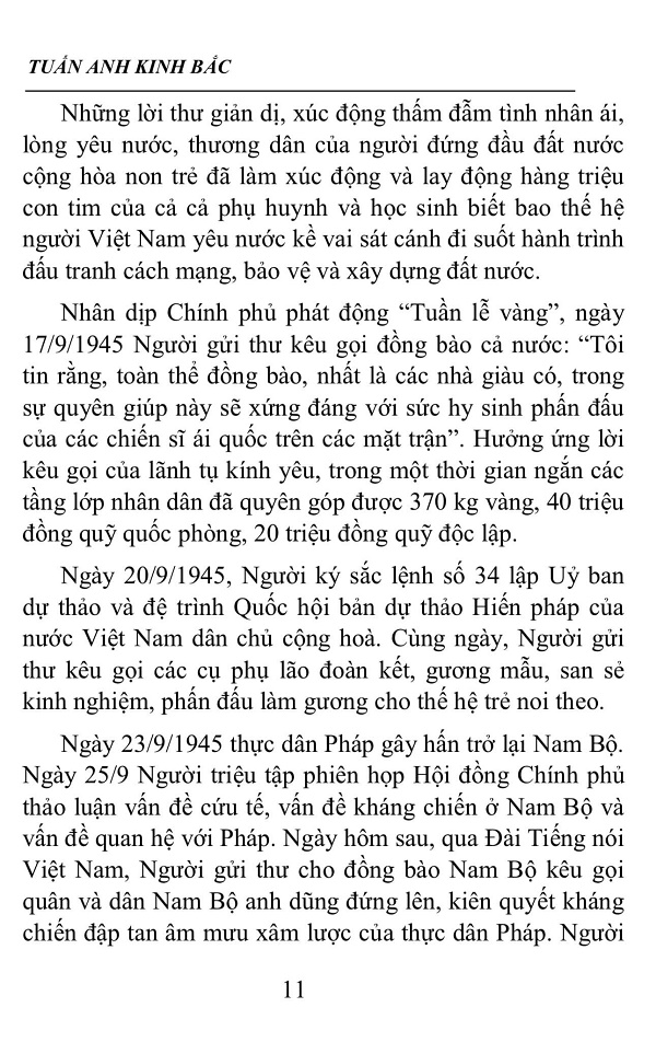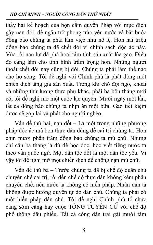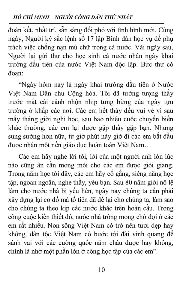 Chủ tịch Hồ Chí Minh - Lãnh tụ kính yêu của dân tộc Việt Nam. Cả cuộc đời Người đấu tranh không mệt mỏi vì độc lập, tự do cho Tổ quốc, vì hạnh phúc của nhân dân. Ngay sau ngày đọc Tuyên ngôn Độc lập khai sinh ra nước Việt Nam Dân chủ cộng hòa, Người đã đau đáu trước những khó khăn chồng chất của đất nước khi đó: giặc đói, giặc dốt; giáo dục nhân dân thực hiện cần, kiệm, liêm, chính; bỏ thuế thân, thuế chợ, thuế đò; thực hiện tự do tín ngưỡng, đoàn kết lương giáo, xây dựng được một nhà nước pháp quyền của dân, do dân và vì dân.