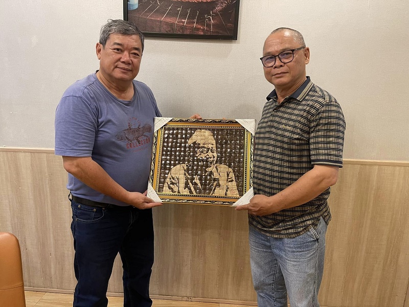 Chú Tư Cang đón nhận bức tranh gáo dừa của nghệ nhân Dương Xuân Bính